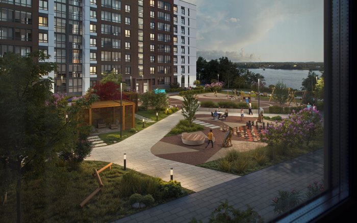 Природа здесь не просто гость, а полноправный житель. Почти половина территории комплекса отведена под благоустройство. Тщательно подобранные деревья, цветы и кустарники создают неповторимый ландшафт, радующий глаз не меньше, чем вид на реку. Живые изгороди гармонично разделяют детские и спортивные площадки, уютные скамейки и беседки, изумрудные газоны и современные малые архитектурные формы. Для комфорта каждого члена семьи предусмотрены также площадка для выгула собак.
