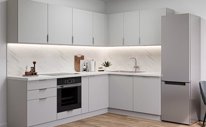С мебелью «Кухня «Бизнес. Классический» Дозаказ Напольные шкафы: высота без столешницы 860 мм; материал — влагостойкий ЛДСП 16 мм (EGGER или аналоги) Навесные шкафы (2 уровня): шкаф 720 или 800 мм и антресоль 240 или 400 мм; материал — влагостойкий ЛДСП 16мм (EGGER или аналоги) Столешница: толщина 26 мм, глубина 600 мм; материал — искусственный камень — акрил (GRANDEX), 2 варианта светлого и 2 темного оттенка Стеновая панель: высота 600 мм; материал — искусственный камень — акрил (GRANDEX), в цвет столешницы Фасады: МДФ с покрытием пленка или краска, стекло (EGGER, Kronospan или аналоги). Фасады серии «Дуэт» или «Фрэско» Цоколь: высота 100 мм в цвет фасада Мойка 500мм*450мм*150мм, материал — искусственный камень Смеситель из нержавеющей стали в цвет мойки, с высотой излива до 30 см, с выходом для подключения фильтра для очистки воды (Omoikiri или аналоги) Ручка-скоба Metakor pronto Дополнительные аксессуары: лоток для столовых приборов, подсветка рабочей поверхности, встроенный дозатор для моющего средства, фильтр для очистки воды, измельчитель пищевых отходов
