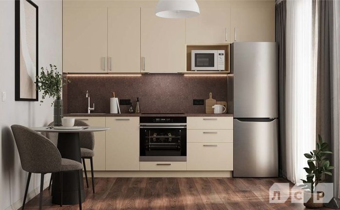 Кухонный гарнитур: материал корпуса и фасада — ЛДСП 16 мм; ручки — металл, матовый хром, межцентровое расстояние 160 мм; фурнитура — петли и направляющие с доводчиком; столешница толщиной 38 мм; стеновая панель; высота (с учетом верхних модулей) — 2 530 мм.