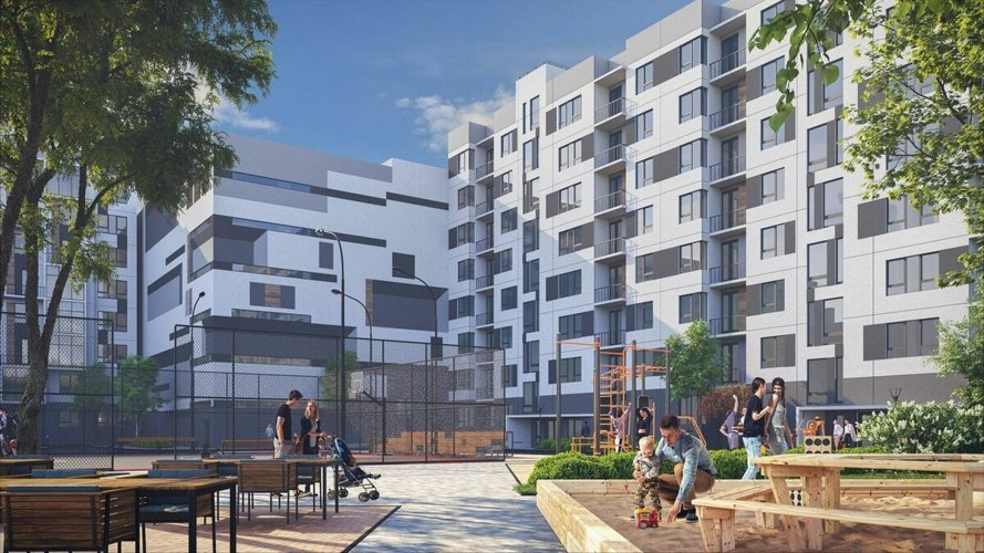 Внутренний двор оборудован зонами отдыха, детскими площадками и зонами для прогулок. Крытый паркинг освободит двор от машин и создаст дополнительные возможности для отдыха и активного времяприпровождения. Рядом находится вся необходимая инфраструктура, включая детские сады, школы, продовольственные магазины, что обеспечит быстрый и удобный доступ ко всем необходимым услугам.