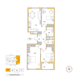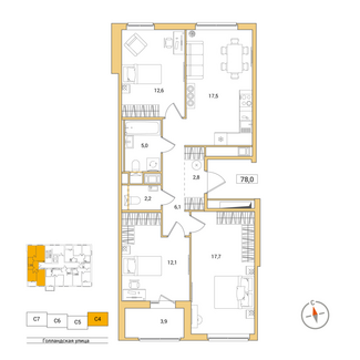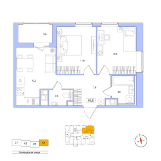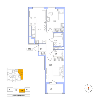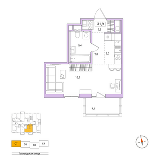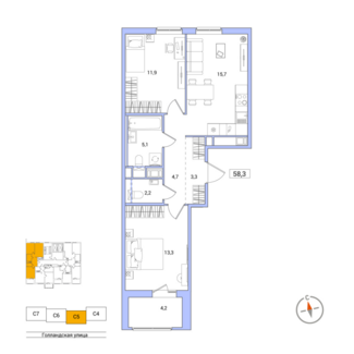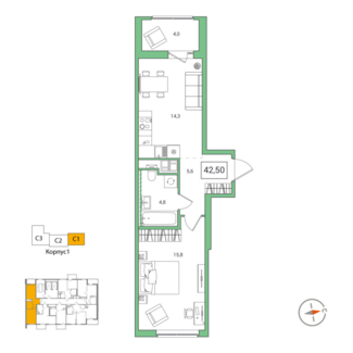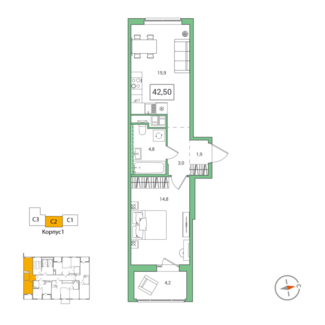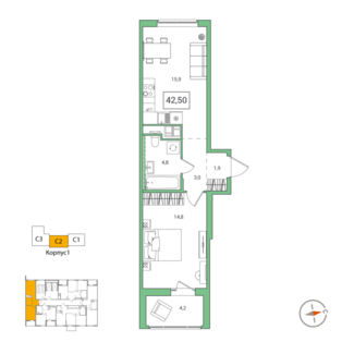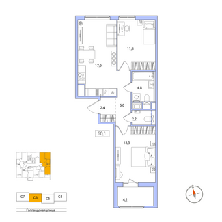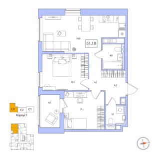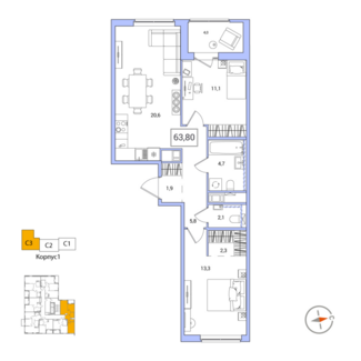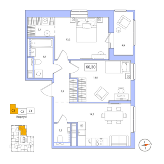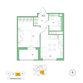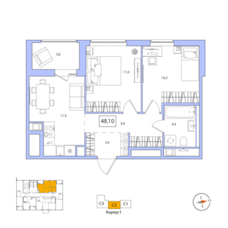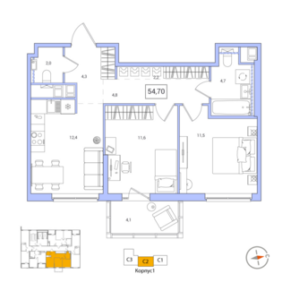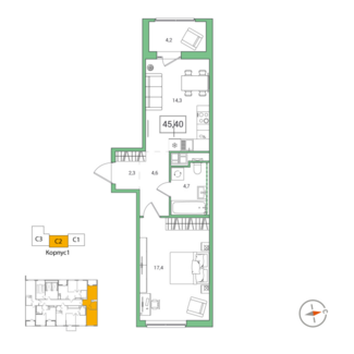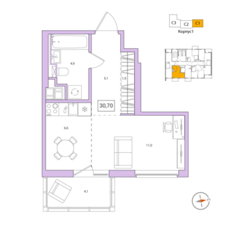 Готовая отделка включает в себя: натяжные матовые потолки и высокопрочный ламинат 32 класса износостойкости, настенную и напольную плитку, входную и межкомнатные двери, виниловые обои под покраску и плинтусы с кабель-каналами, розетки и выключатели, встраиваемые светильники в санузлах, радиаторы и счетчики, а также домофон.