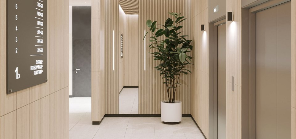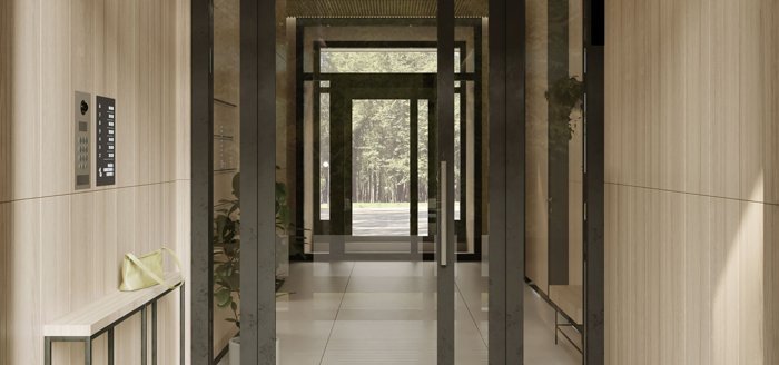 Входные группы расположены на уровне земли, а сами парадные имеют теплый тамбур и два выхода: во двор и на парковочную зону. Гостевые холлы светлые, просторные и безопасные, с понятной навигацией, просторными колясочными и комфортной зоной ожидания курьеров и гостей.