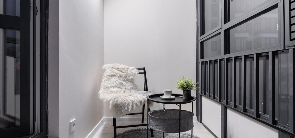 Застекленные балконы с выведенными розетками и керамогранитом на полу.