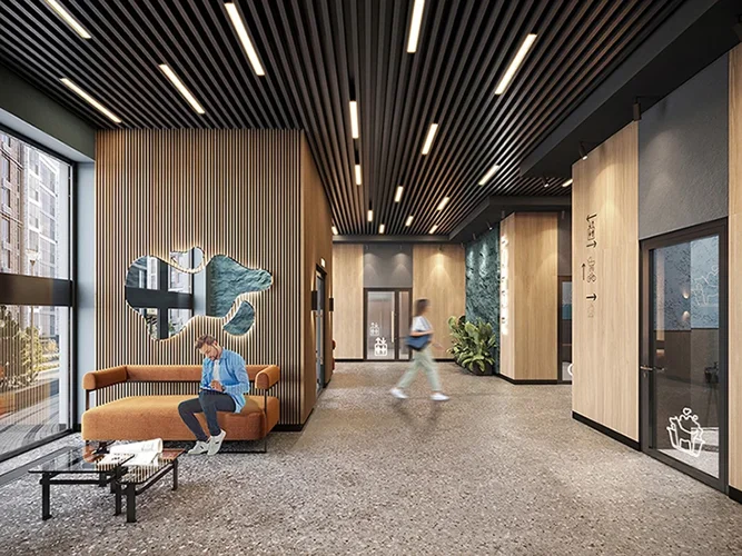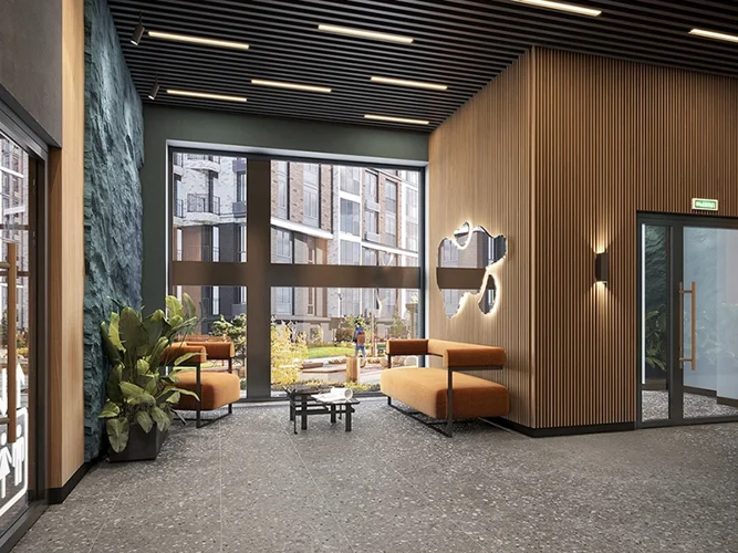 Архитектура проекта - элегантный модернизм в сочетании с игрой пространственных форм и цветовым ритмом. В основе концепции благоустройства идея создания единого увлекательного ландшафтного пространства, включающего в себя пейзажные зоны и интерактивные архитектурные композиции. Дизайн парадных зон и входных групп - сочетание лаконичности отделки и декоративных элементов с текстурами из натурального камня и дерева с приглушенной подсветкой теплым светом.