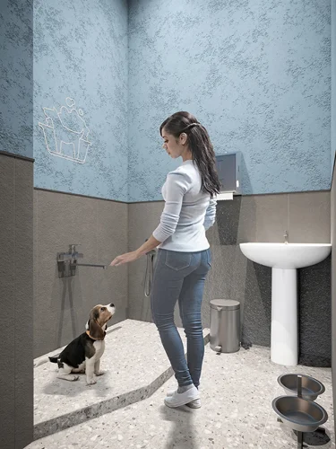 Отдельное помещение оборудованное трапом, где удобно мыть не только питомцев после прогулки, но и велосипеды и игрушки для песочницы. Для удобства это помещение расположено на первом этаже в приватной части холла, то есть пользоваться этим помещением могут только жильцы дома.